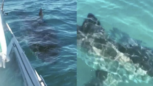 Video: Manden står på båd, så ser han KÆMPE hvidhaj komme med dem